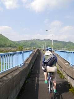 みんなまんぷくになったおなかを抱えて片鉄サイクリングロードの終点を目指します。 (吉井川に架かる歩行者・自転車専用の立派…