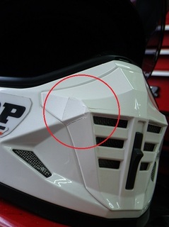 こないだ、シートの上にヘルメット置いといたら落下・・・ なんとか足で受け止めたけど、 マウスベンチレーションが割れた・・…