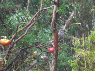 庭のカイヅカイブキに傷んでしまったリンゴをぶっ挿したら、 すぐに”ヒヨドリ”がやってきた! あっち向いたりこっち向いたり…