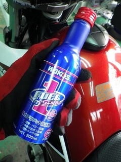 続いては、エンジン内部のリフレッシュ。 ワコーズさんの”フューエル1”をガソリンに添加します! (バイクはガソリンタンク…