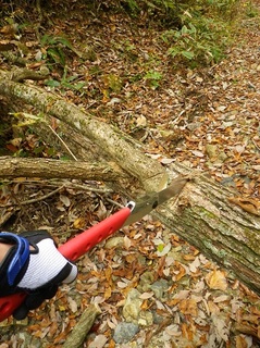 この倒木切るのに(2ヶ所)けっこう時間かかった・・・ かたくってなかなか切れない。 やっと切り終わって見上げると枯れ葉が…