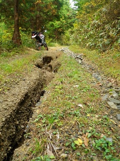 ”通ヶ谷山”は、雨裂が地割れのように深く (ここはまだ良い方) ガレ具合もだんだんとひどくなってくるので、この先が不安に…