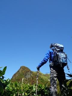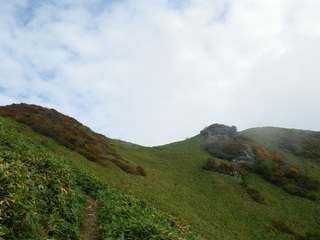 視界が開けてきたのはいいんですが、 (頂上が見えてきた!) 登山道が急な斜面に作られてるのでこわい・・・ 風ももろ吹き付…