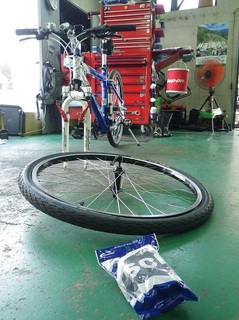 MTBをとめてたら、『ぷしゅ~~~』って急に。 パンク修理。 (お泊りサイクリングの時じゃなくてよかった!) 何かが刺さ…