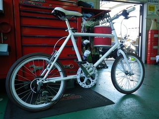 新たなメンテ依頼自転車。 真っ白でおしゃれな”ミニベロ”ですね~(^-^) まずはブレーキ調整。 ブレーキシューがズレて…