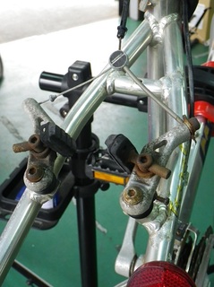 ”カンチブレーキ”にとりかかります。 錆がひどいので全とっ換え! グレードを言わなければ、自転車のパーツってけっこう安い…