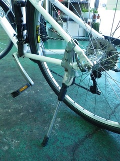 奥さんのクロスバイクにはサイドスタンドがついていますが、 前カゴつけると不安定。 荷物入れるとさらにひどく、倒れます・・…