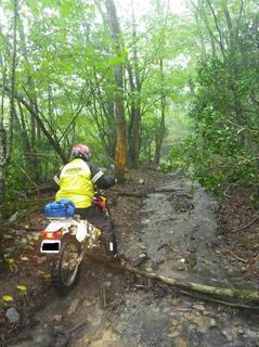 雨が降ってると、上りの途中にあるこの程度の倒木でもやっかいです。 うっかり斜めに進入すると、簡単に横に流れます! 3本目…