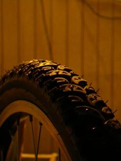 明日に備えて、MTBに”スパイクタイヤ”履いときます! (作業中に雪がちらつき始めました)
