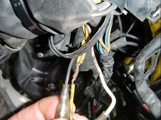 ステムをはずすのにヘッドライトまわりもはずすので、ついでに配線のチェック。 すると、ヘッドライトカウル裏の配線の束の中に…