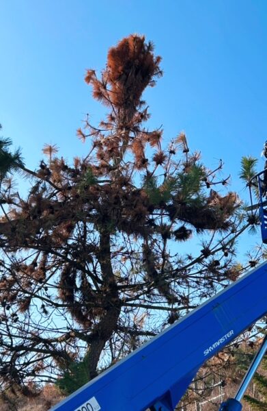 枯れた松の木の剪定のお手伝いに行ってきたんですが、 枯れた枝を切った断面を見てみると青黒いシ…