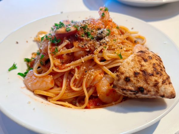 田尻の野菜を使ったトマトのシーフードパスタと、