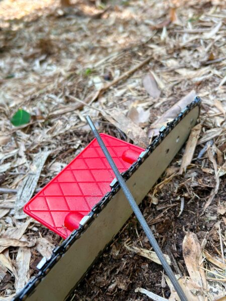 倒した木の枝打ちをしてたら、隠れた岩をうっかり切ってしまい刃が痛む・・・