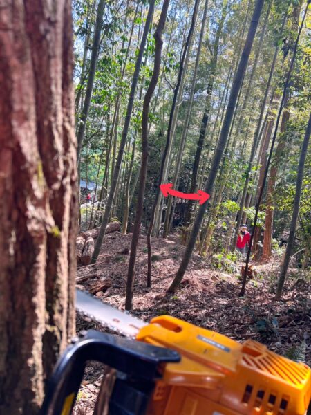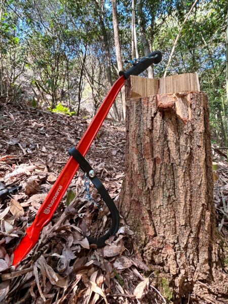 狙い通り倒れましたが、先端が太い竹にひっかかって”かかり木”になってしまったので、