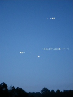 明け方、月-火星-木星と並んで見えるらしいので、 早起きして見ようと思ってたんですが、寝坊・・・(^-^; もう空は白み…