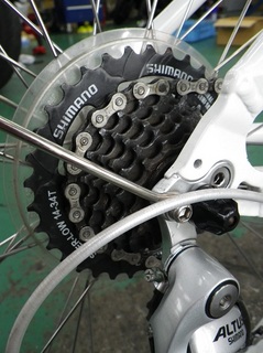奥さんのクロスバイクのリヤスプロケット(7速14-34)には、 一速が”スーパーロー”と大きく、 町乗りではまったく使う…