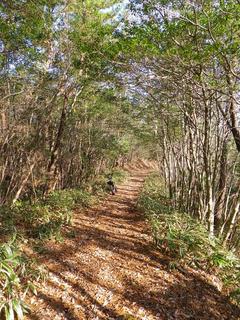 ”新重山林道”中ほどは、落ち葉の積もる雰囲気のいい林道になっていますよ(^-^) (落ち葉に埋まってる木の枝には気をつけ…