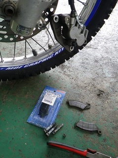 DRZのFブレーキパッドの交換。 他にもメンテして、林道に行く準備はOK! 車検も受けたし、もう15万kmオーバーですが…