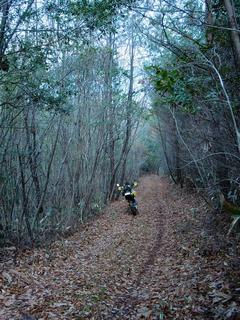 入ってみると、なかなか雰囲気のいい林道(^-^) でも、落ち葉の下はヌタってて、その中に木の枝が斜めに隠れててマジでコケ…