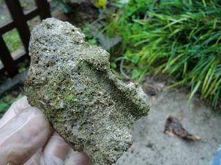 今日は1日庭いじりですが、 こんなブロックの破片を見つけ、この鉄筋が入ってた跡に、”トキワシノブ”の根茎がぴったりはまり…