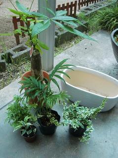 今日は、ホームセンターに行って、 いろいろセール品をお安く買ってきて、寄せ植えを作ります。 (パキラ、テーブルヤシ、プミ…