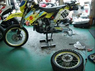 お昼休憩に、DRZの前後タイヤ交換(*^-^) 先日の芸北方面林道ツーリングでは、Fタイヤの空気圧をまあまあ入れてたのに…