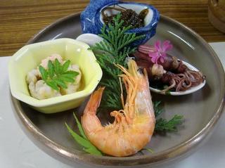 宿に戻って、18:30からお楽しみの宴会スタート! よし正さんの宴会料理を一挙ご紹介。 サザエ。 お刺身はカンパチ、タイ…