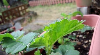 昨日はよく雨が降りました。 今朝庭に出るといい天気! いつものようにイチゴの葉っぱにきれーに雨粒がついてましたが、 咲い…