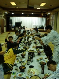 宴会は18時からスタート! 宴会料理はとても豪華でしたね~ 鍋は、”きじ鍋”でした。 あまごの骨酒なんてのもでてきました…