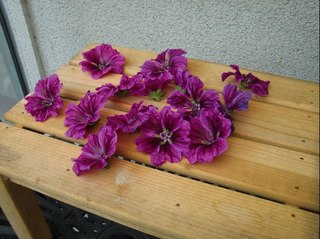 今朝庭を見ると、 マロウにまたたくさん花が咲いてたので、摘み取り。 (口に入れるハーブには、ケムシよけスプレーは吹けない…