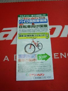セブンイレブンの自転車保険に入った。 よく自転車に乗っているので、もしものことを考えると入ってると少しは安心。